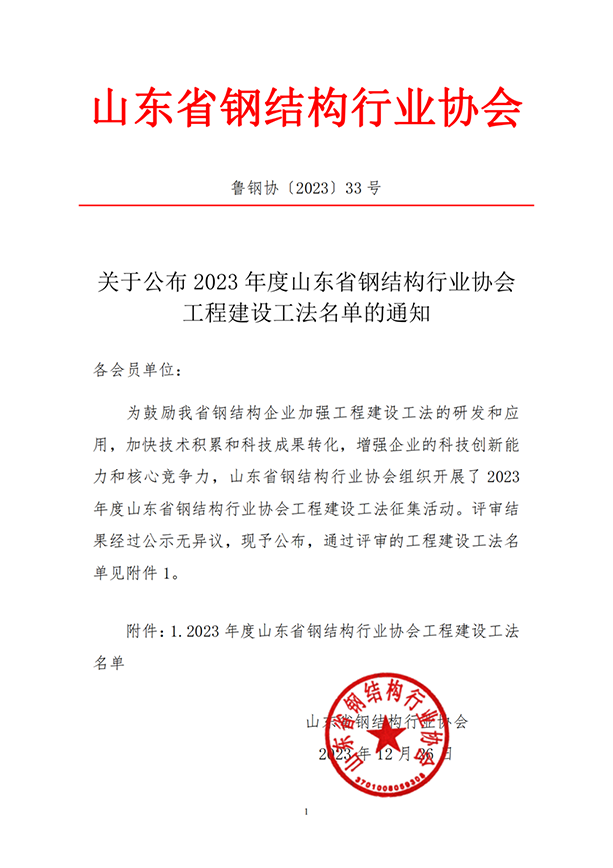 近日,山東省鋼結(jié)構(gòu)行業(yè)協(xié)會(huì)公布了工程建設(shè)工法及優(yōu)秀QC成果,公司獲批兩項(xiàng)工程建設(shè)工法,榮獲四項(xiàng)優(yōu)秀QC成果:“大跨度網(wǎng)架高空滑移”、“鋼梁高空吊裝快速定位安裝的施工”獲批2023年度省鋼結(jié)構(gòu)行業(yè)工程建設(shè)工法;“成品巖棉夾芯復(fù)合板起鼓問題原因...